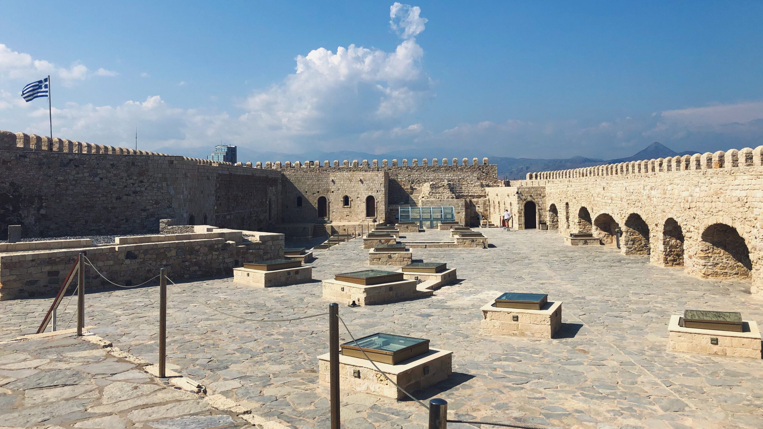 Die ersten beiden Tage unserer Reise haben wir in der Hauptstadt Heraklion verbracht. Genug Zeit also, um die Sehenswürdigkeiten der Stadt zu erkunden. Wir haben uns das alte venezianische Hafenbecken, welches von der gut erhaltenen Koules Festung begrenzt wird, angeschaut. Das empfehlen wir euch auch, da die Festung als Wahrzeichen der Stadt gilt. Vorbei an den venezianischen Arsenali, in denen wohl früher große Galeeren gebaut und repariert worden, geht man entlang der ca. 1km langen Hafenmole zur Festung. Wenn man dieses sonnige Stück geschafft hat, bietet die Festung anschließend genügend Schatten, um sich wieder abzukühlen 😊. Die Besichtigung kostet mittlerweile 10€.
